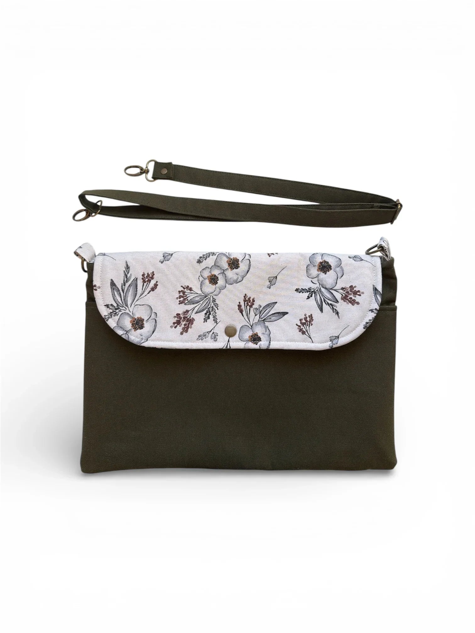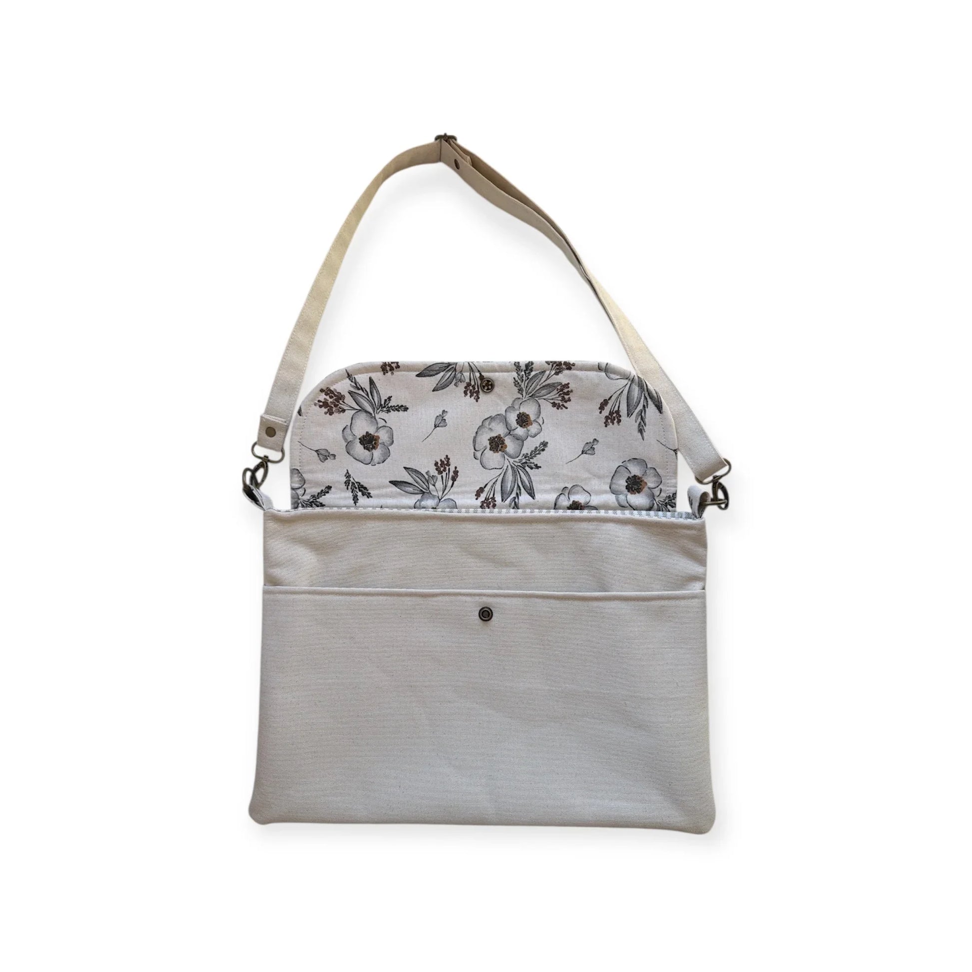 The front pocket with a delicate Meadow floral flap keeps smaller items within reach, while the main compartment comfortably fits up to a 15-inch laptop. An adjustable canvas strap allows you to wear it crossbody or over the shoulder for hands-free comfort on workdays, school days, or coffee shop afternoons.